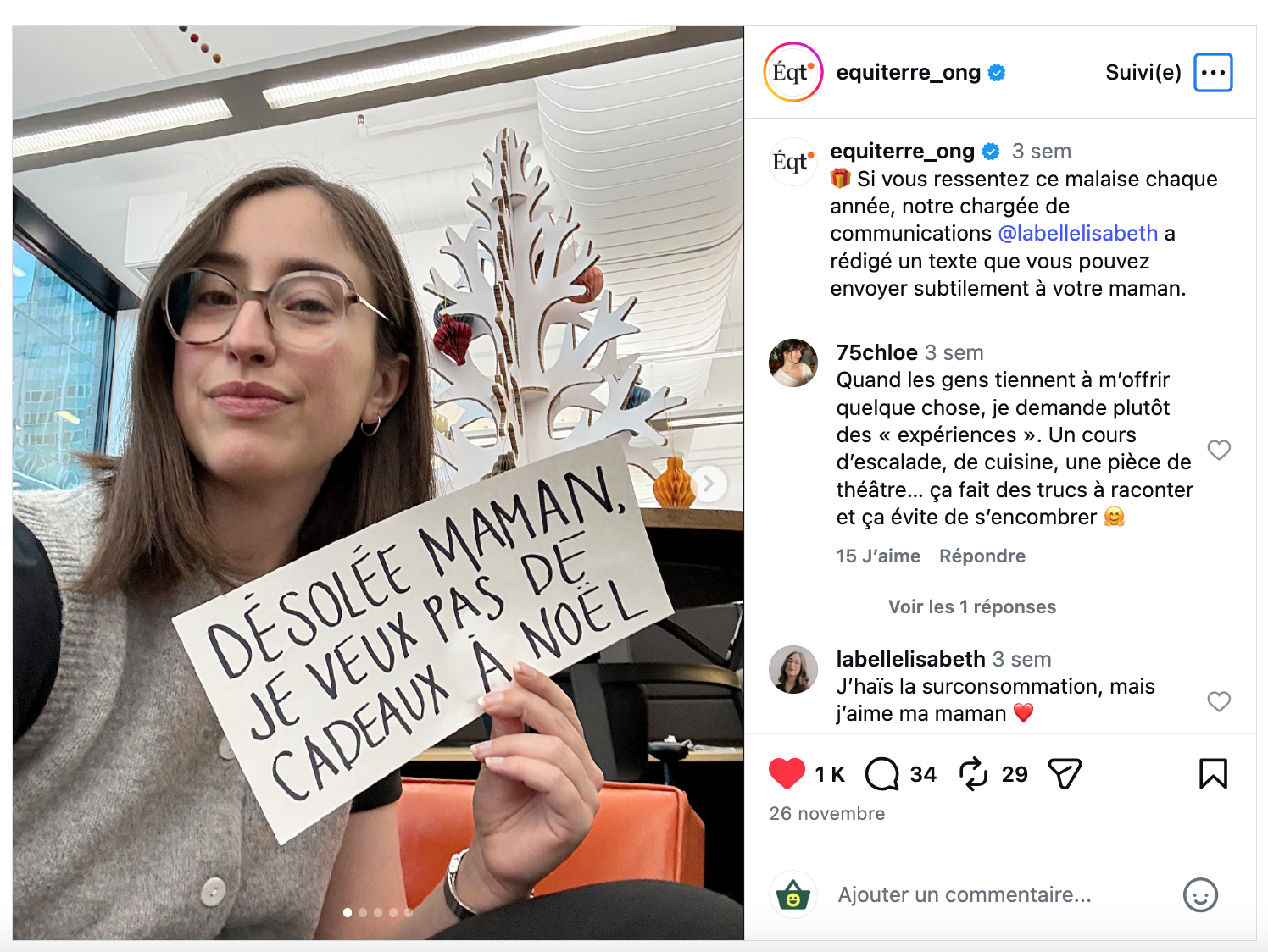- De son côté, Équiterre invite à repenser notre rapport à la consommation : et si les fêtes étaient avant tout l’occasion de créer des souvenirs, plutôt que d’accumuler des objets?
